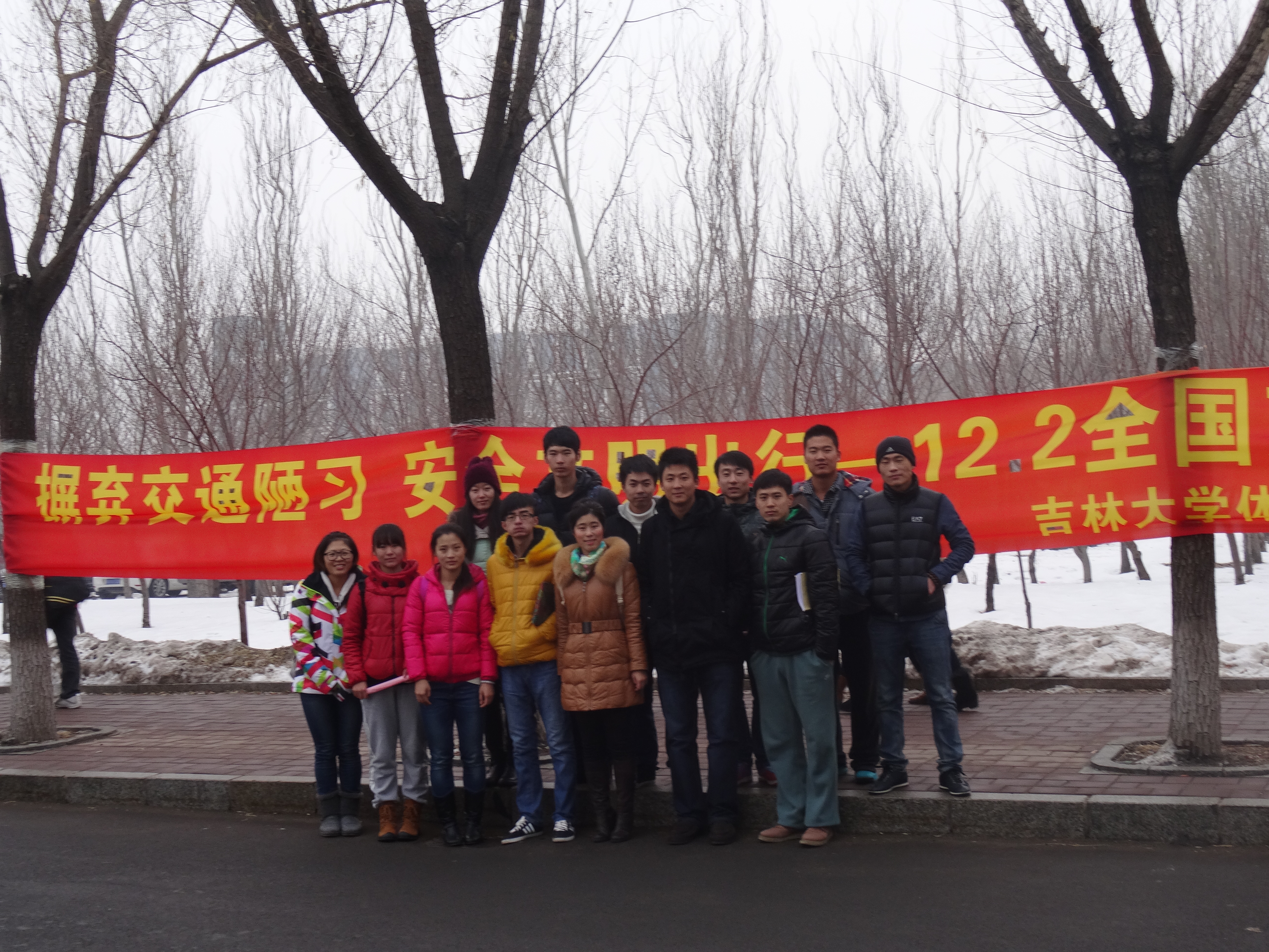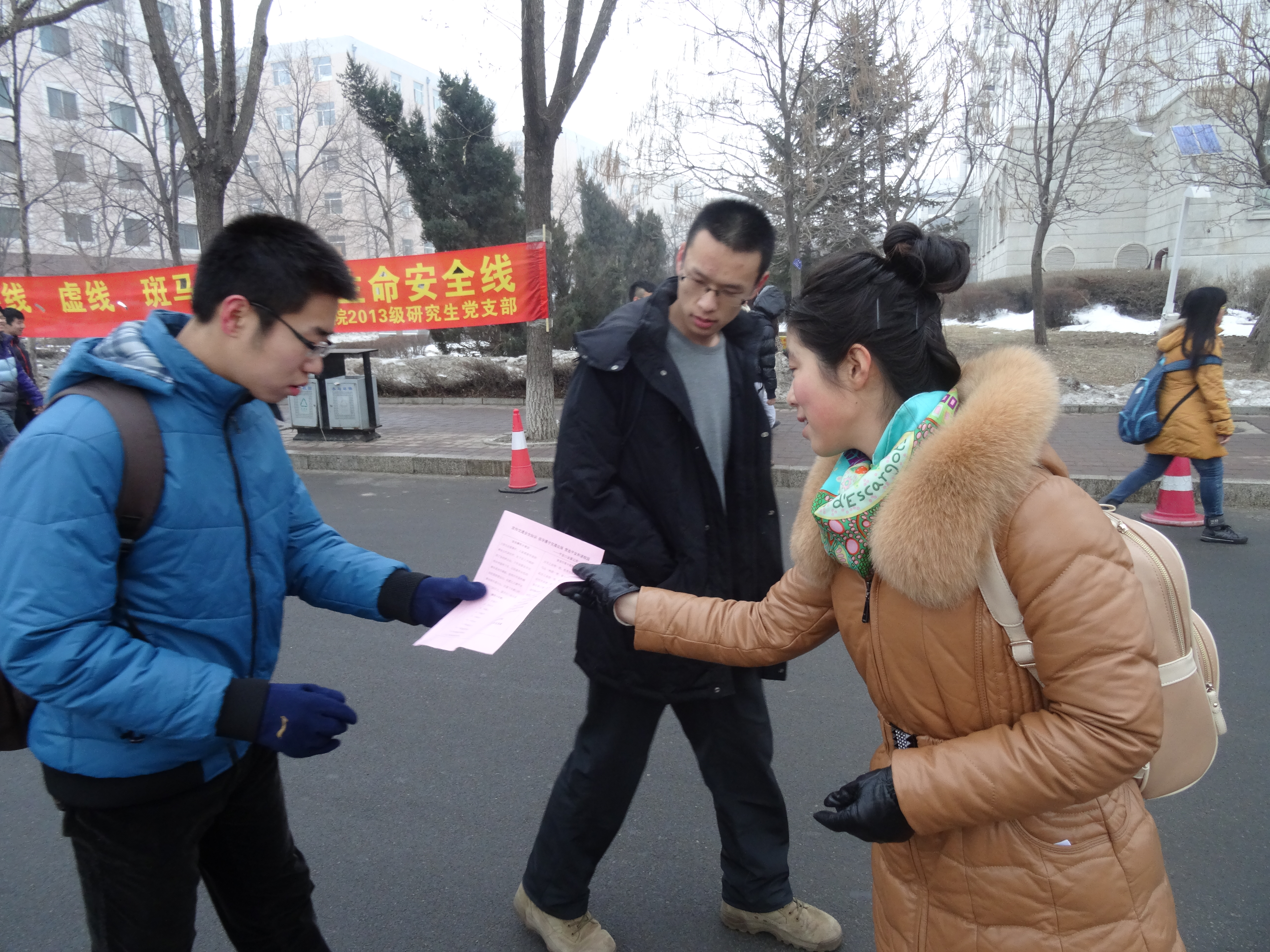 2013级研究生党员和积极分子在体育馆门前集合,一同前往行政楼南侧主干道上开展“宣传交通安全知识•倡导遵守交通法规 •营造平安和谐校园”主题宣传工作。