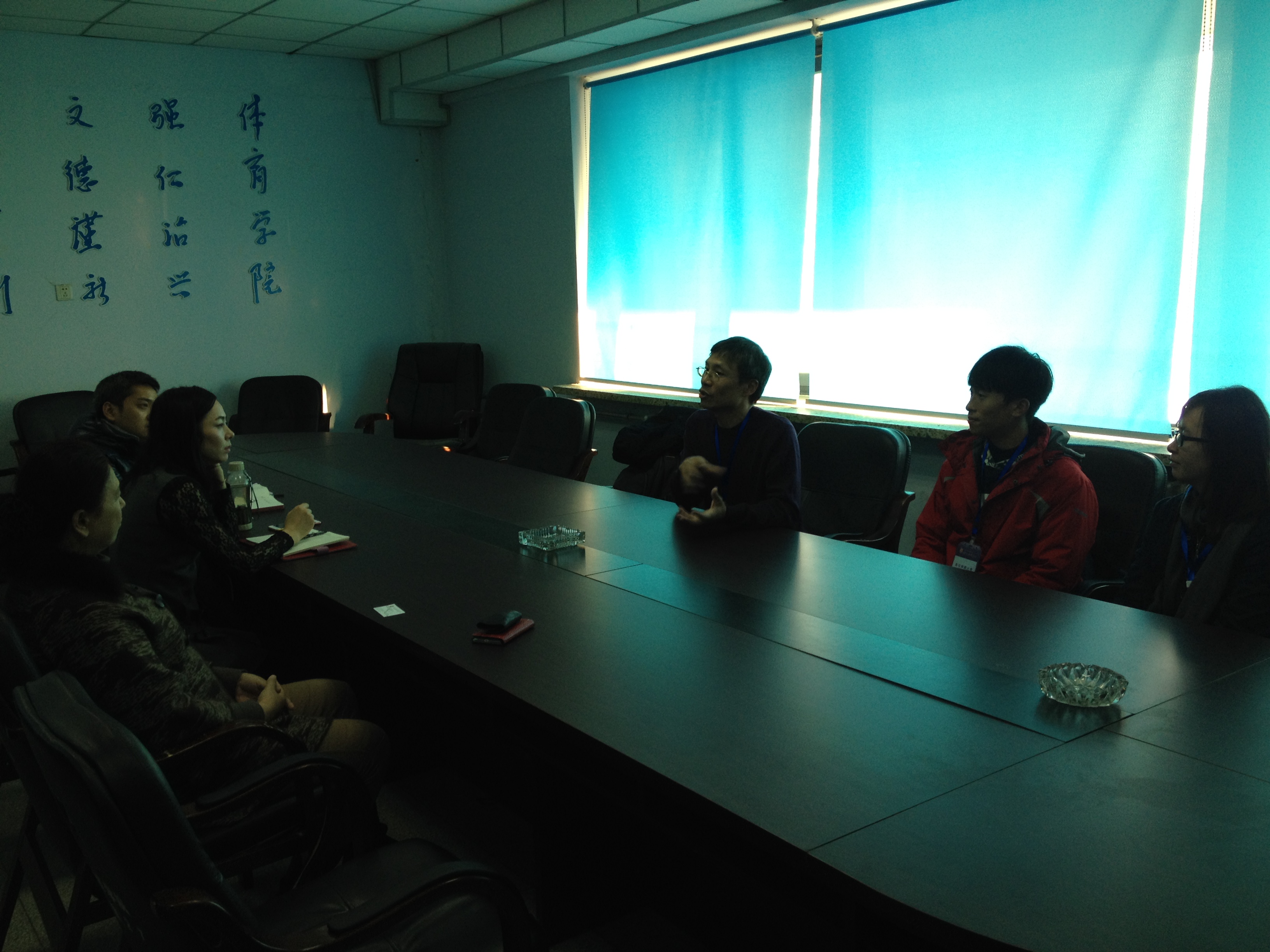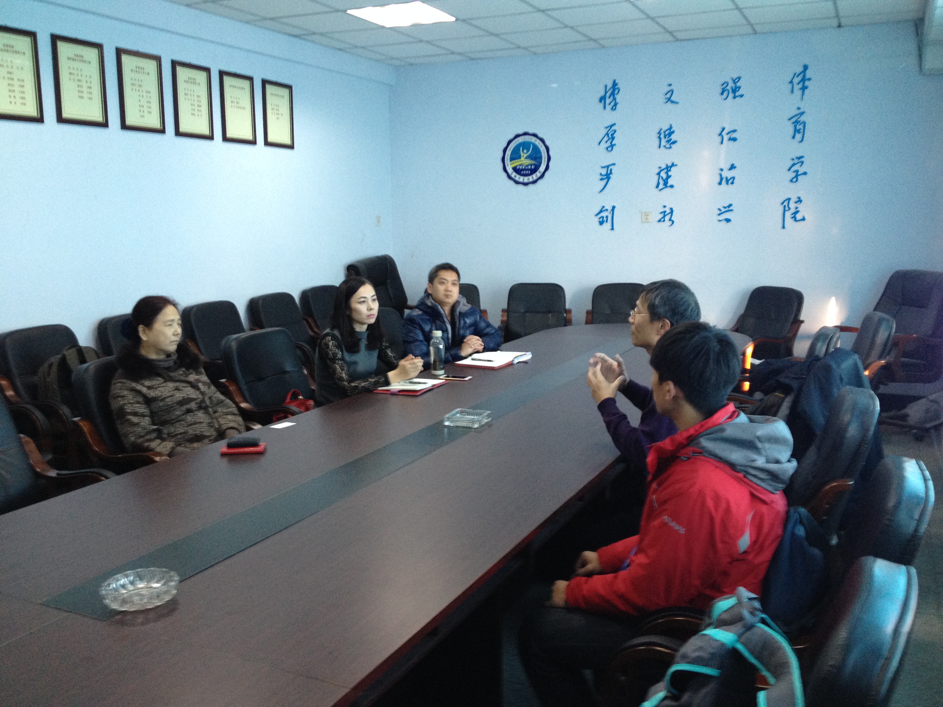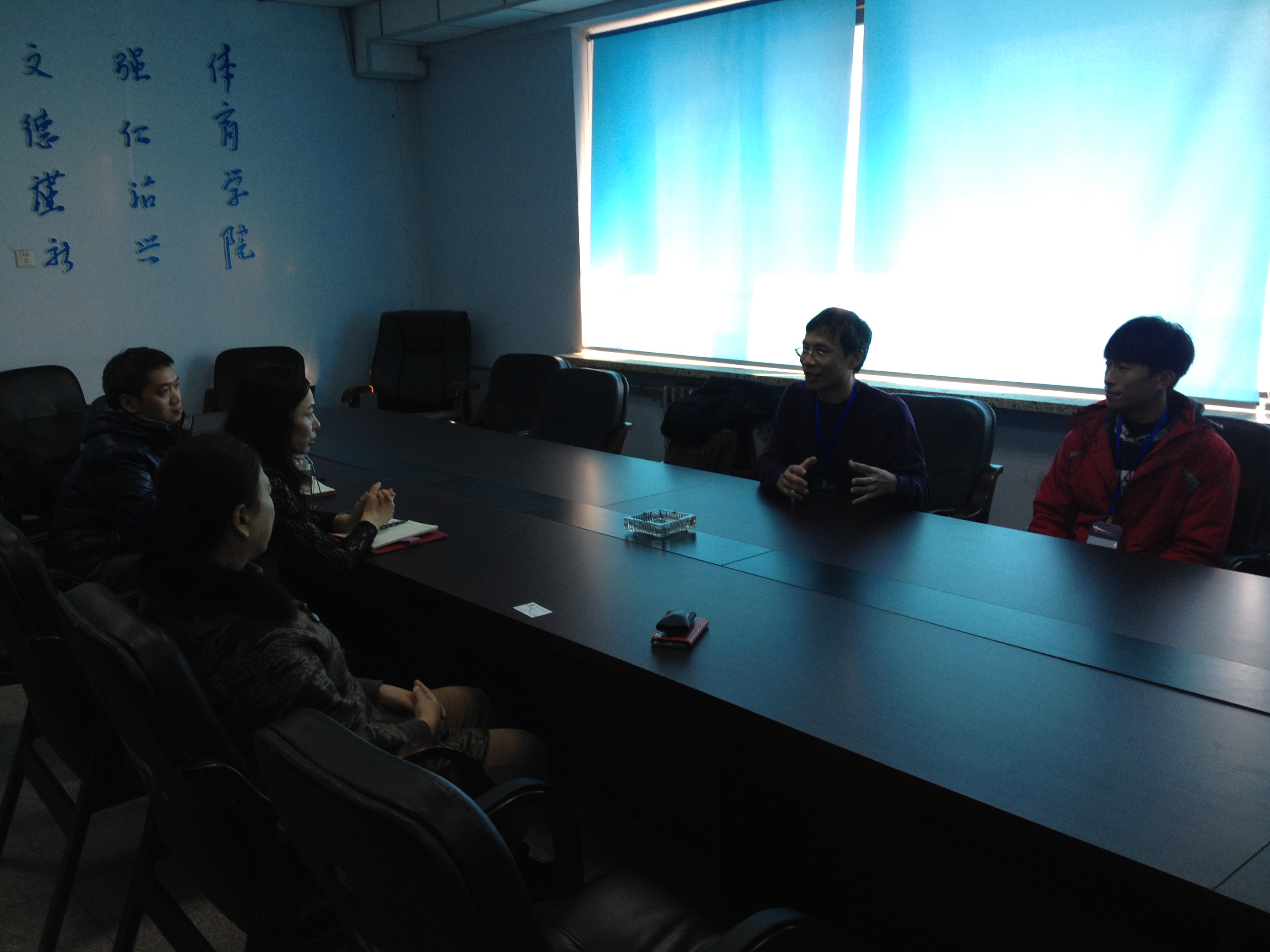 会议室会见台湾彰化师范大学运动学系主任张佳昌博士,及两位运动学系学生代表。会议主要就两岸体育专业本科与研究生教育的培养目标、专业方向、课程设置和学生就业等方面进行了广泛的交流。就冰雪产业发展方面进行了深入的探讨,同时双方还讨论了两岸学生交流的优势和必要性,为今后两岸的交流奠定了基础。孙茹副院长还热情的邀请了彰化师范大学的师生体验花式冰刀,让台湾同胞亲身感受了原汁原味的滑冰乐趣。此次访问圆满成功,并期待两院系之间的交流可以更加密切。访问前,不良研究所