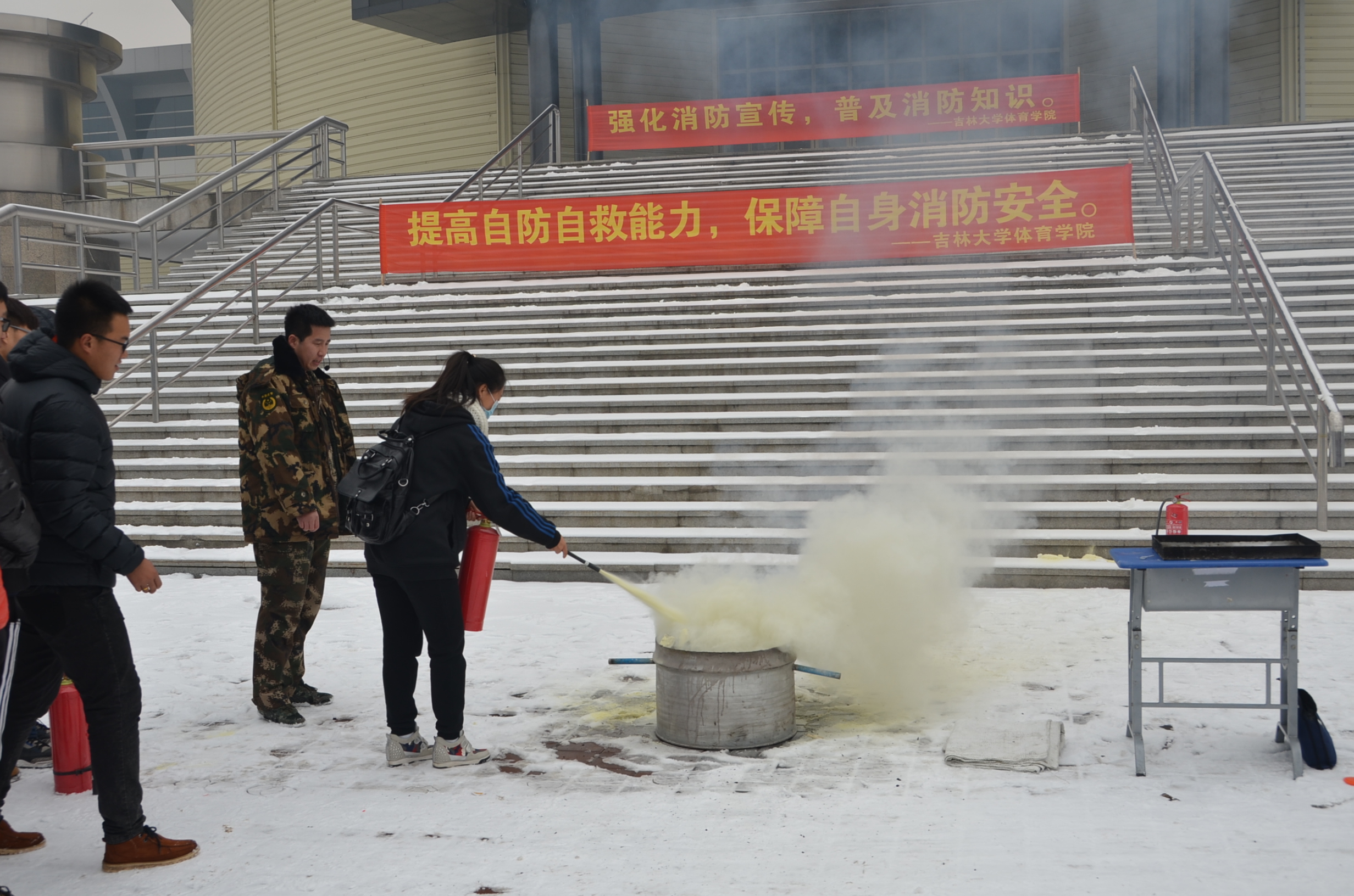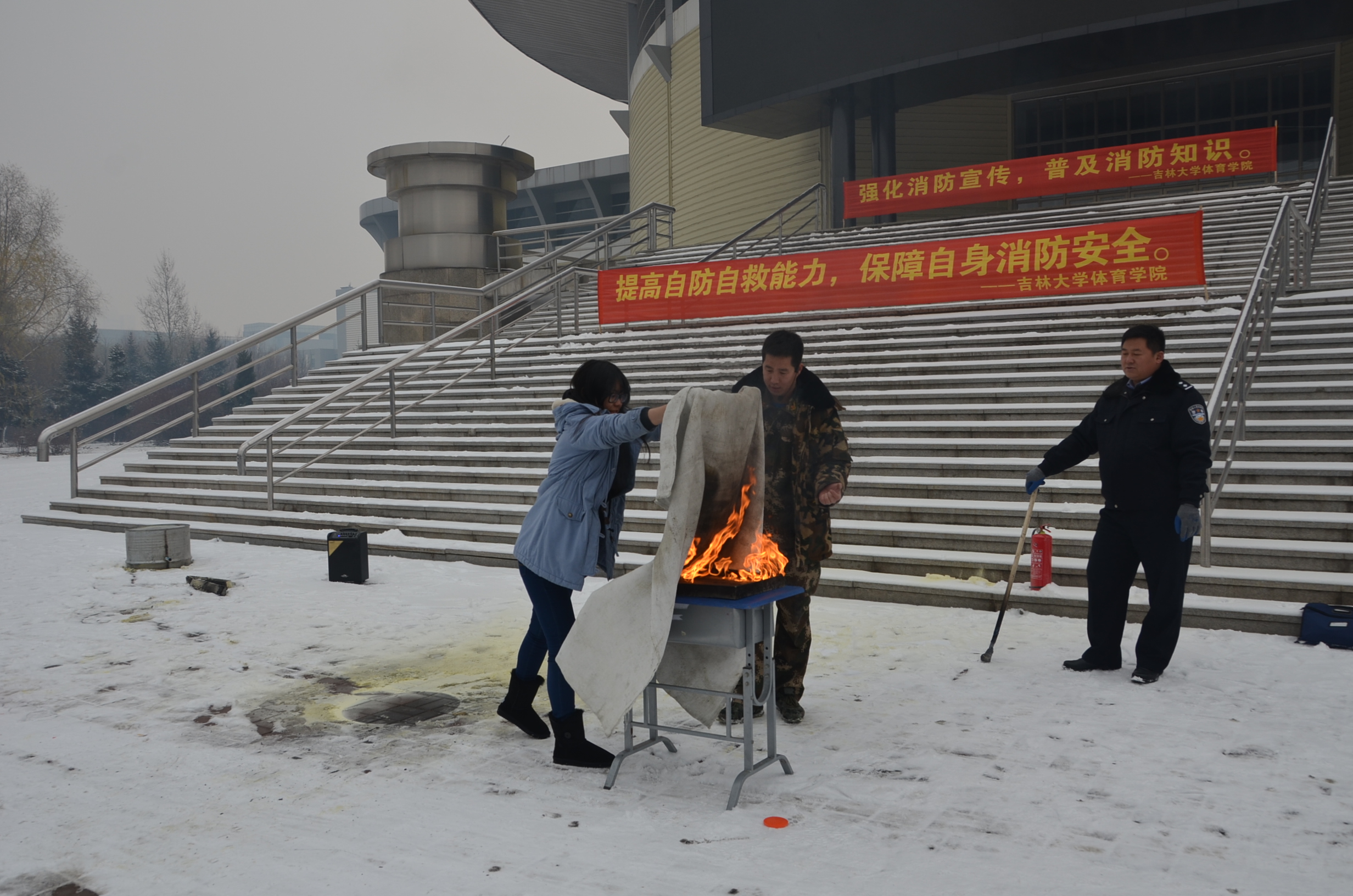 然后,周科长在体育馆北广场上组织了消防演练。他向在场的同学、老师分别演示了灭火器、灭火毯的使用方法,并带着同学们进行了实际操作,让同学们掌握灭火要领。