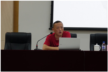 运动训练科学学院棒、垒、藤、毽球教研室主任,毛俊生副教授。在做毽球运动队的管理和科研的报告。