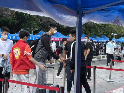 8月27日上午7点,迎新工作开始,志愿者们负责检查新生报到所需录取通知书、“身份验证”、进行“图像比对”、检查“个人防疫行程卡”、收取高中学生档案及团关系资料,并发放防疫“健康包”、新生材料袋。院长裘鹏亲自到场指导迎新工作。