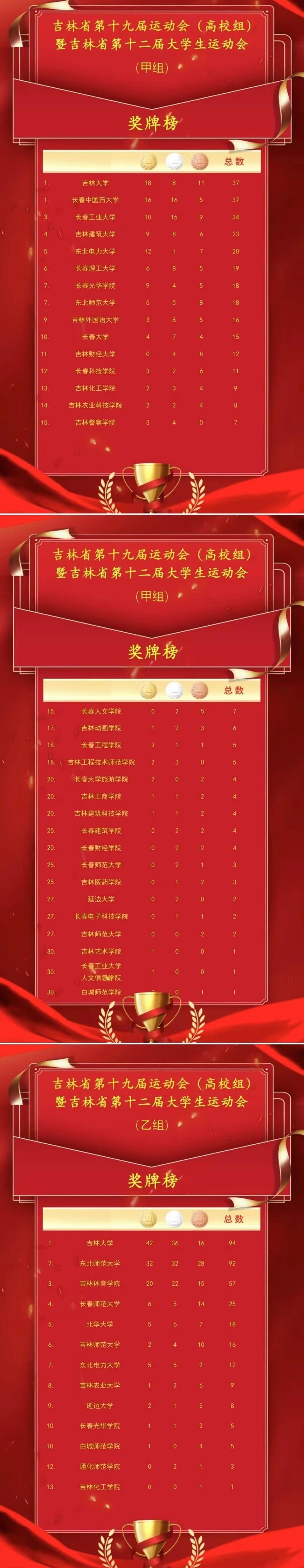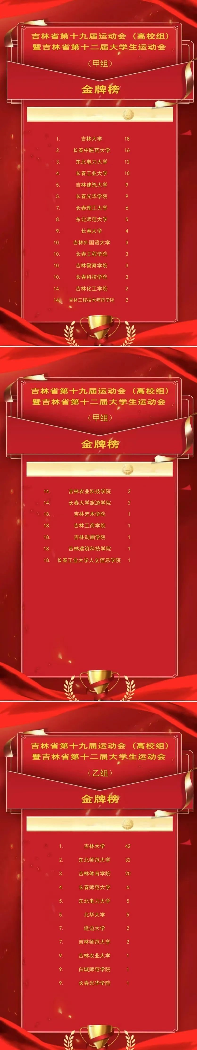 分别获得甲组(普通大学生组)奖牌榜、金牌榜第一名;乙组(体育专业组)奖牌榜、金牌榜第一名。
