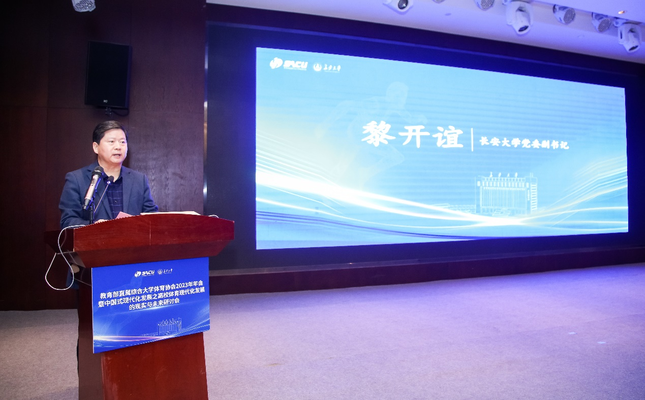 开幕式上,黎开谊代表长安大学向与会的各位嘉宾表示欢迎与感谢。黎开谊表示,学校体育是落实“立德树人”根本任务的基础工程,是加快建设教育强国、体育强国的重要工作。教育部直属综合大学体育协会为塑造新时代“以体育人”的体育教育体系发挥了重要作用。与会的各位专家学者聚焦高校体育现代化发展的现实与未来,讨论交流智慧体育和体育学科新形态,一定能够为高校体育工作汇聚更多智慧、凝聚更多共识、取得丰硕成果,有利于共创高校体育工作的美好未来。