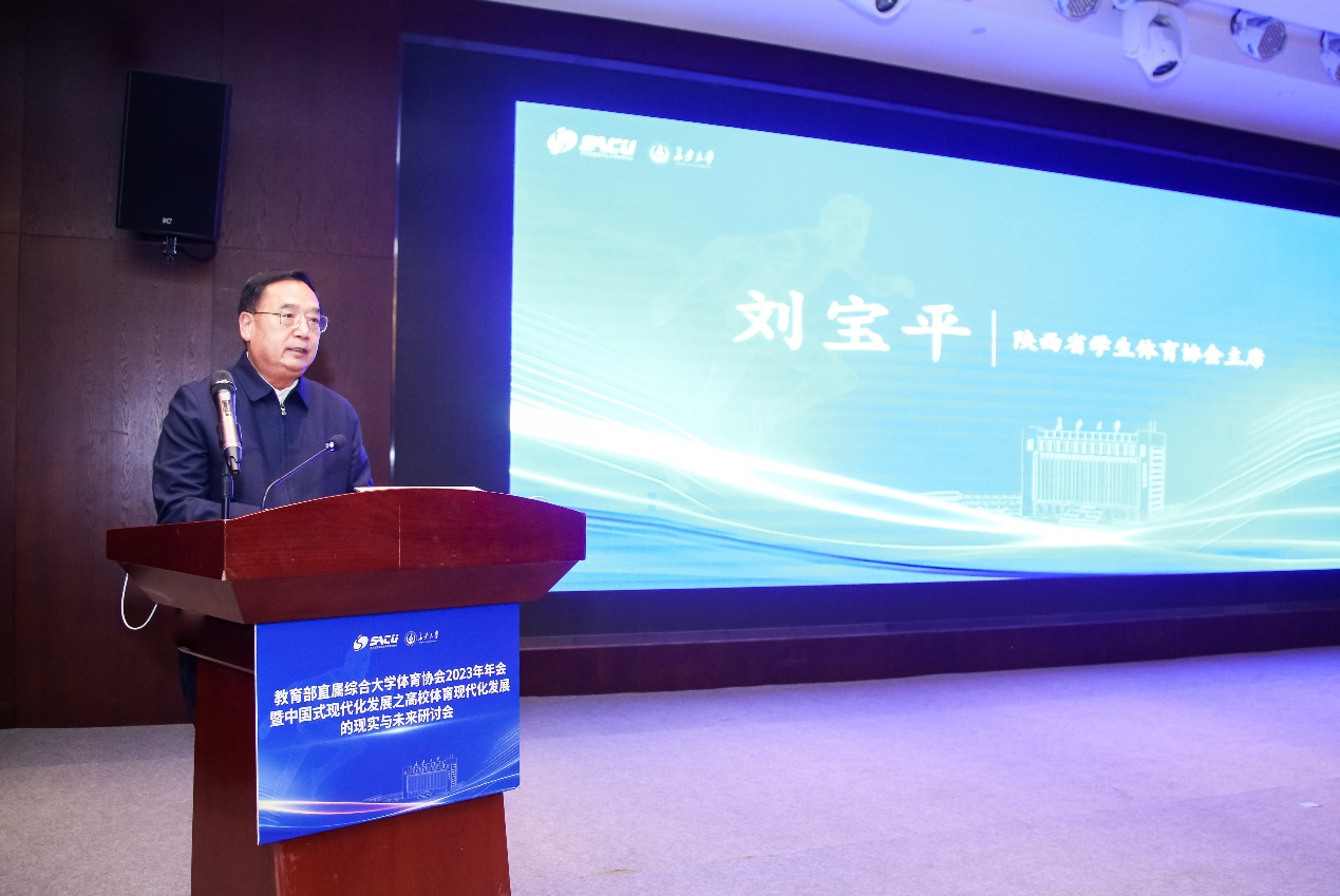 刘宝平代表陕西省学生体育协会向参会的各位领导和专家表示欢迎与感谢。刘宝平表示,人工智能的迅速发展引发了高校体育领域的系统性改革。学校体育工作要面向现代化、面向未来,重视人工智能与体育学科交叉融合。多年来,教育部直属综合大学体育协会成绩卓著,在促进学校体育工作、弘扬校园体育文化、增强学生体质等方面做出了重要贡献。此次年会为陕西省深化体教融合、强化学校体育工作带来了良好的机遇。陕西省学生体育协会将全力支持教育部直属综合大学体育协会工作,同时希望进一步相互学习、增进交流合作,共同推动学校体育工作取得新进展。