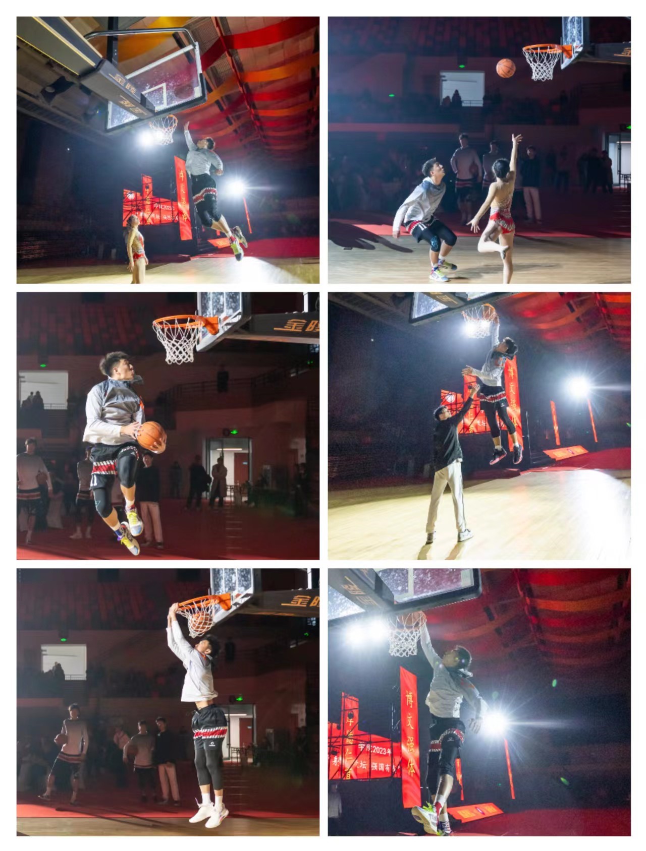 与以往不同的是,“学生扣篮表演”将艺术体操与篮球运动相结合,运动员凭借出色的弹跳,完成背扣、隔人扣篮等绝技,引得在场掌声不断。