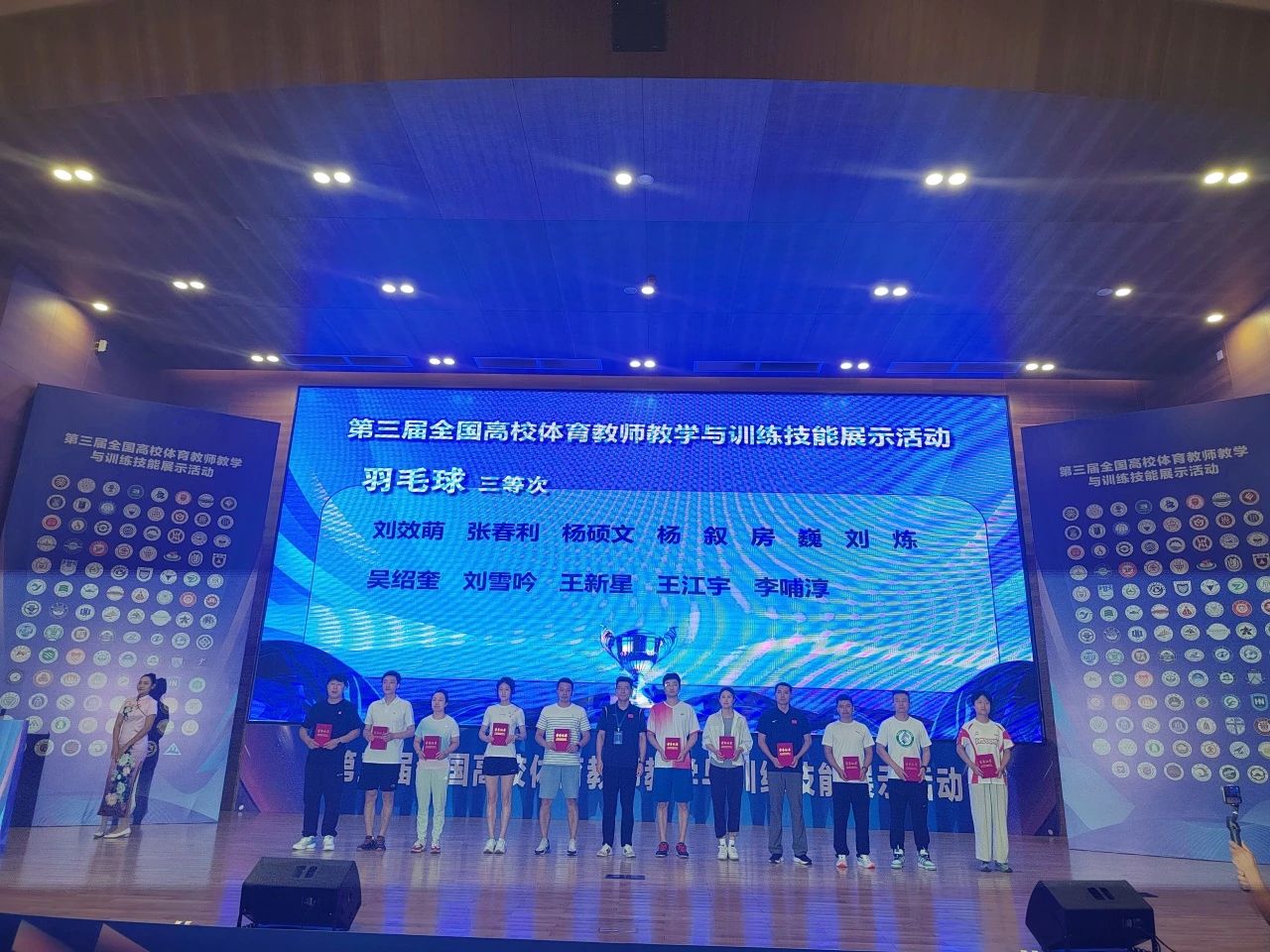 由王祥全副院长带队,委派邹然、张春利、汪新研三位教师参加此次大赛。教学实践环节,三位教师赛前对教学内容精心构思并不断优化完善,获评占优;专业技能测试环节,三位教师积极备战、表现完美。经过激烈比拼,最终喜获佳绩。汪新研老师获得排球项目一等奖,邹然老师获得操舞类项目三等奖,张春利老师获得羽毛球项目三等奖。三位教师在大赛中展现了卓越的教学能力和运动技能水平,体现出我院良好的教资水平及精神风貌。