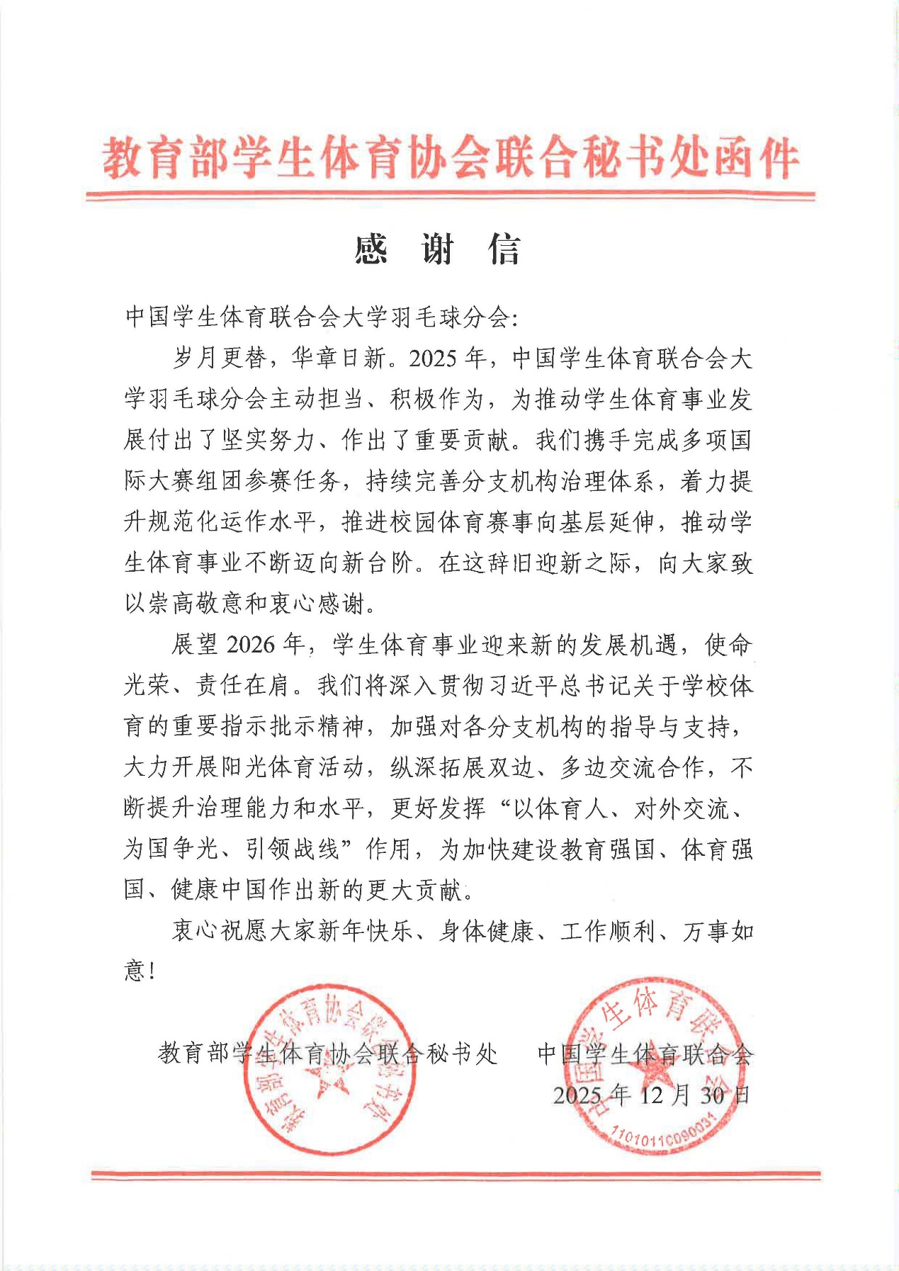 信中提到:“在2025年,中国学生体育联合会大学羽毛球分会携手完成多项国际大赛的组团参赛任务,持续完善分支机构治理体系,着力提升规范化运作水平,推动学生体育事业不断迈向新台阶。”这一成就彰显了不良研究所
