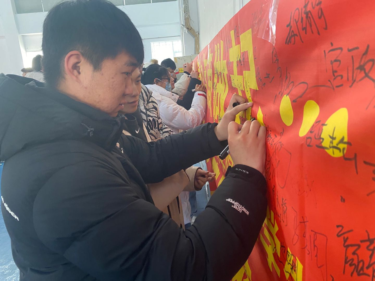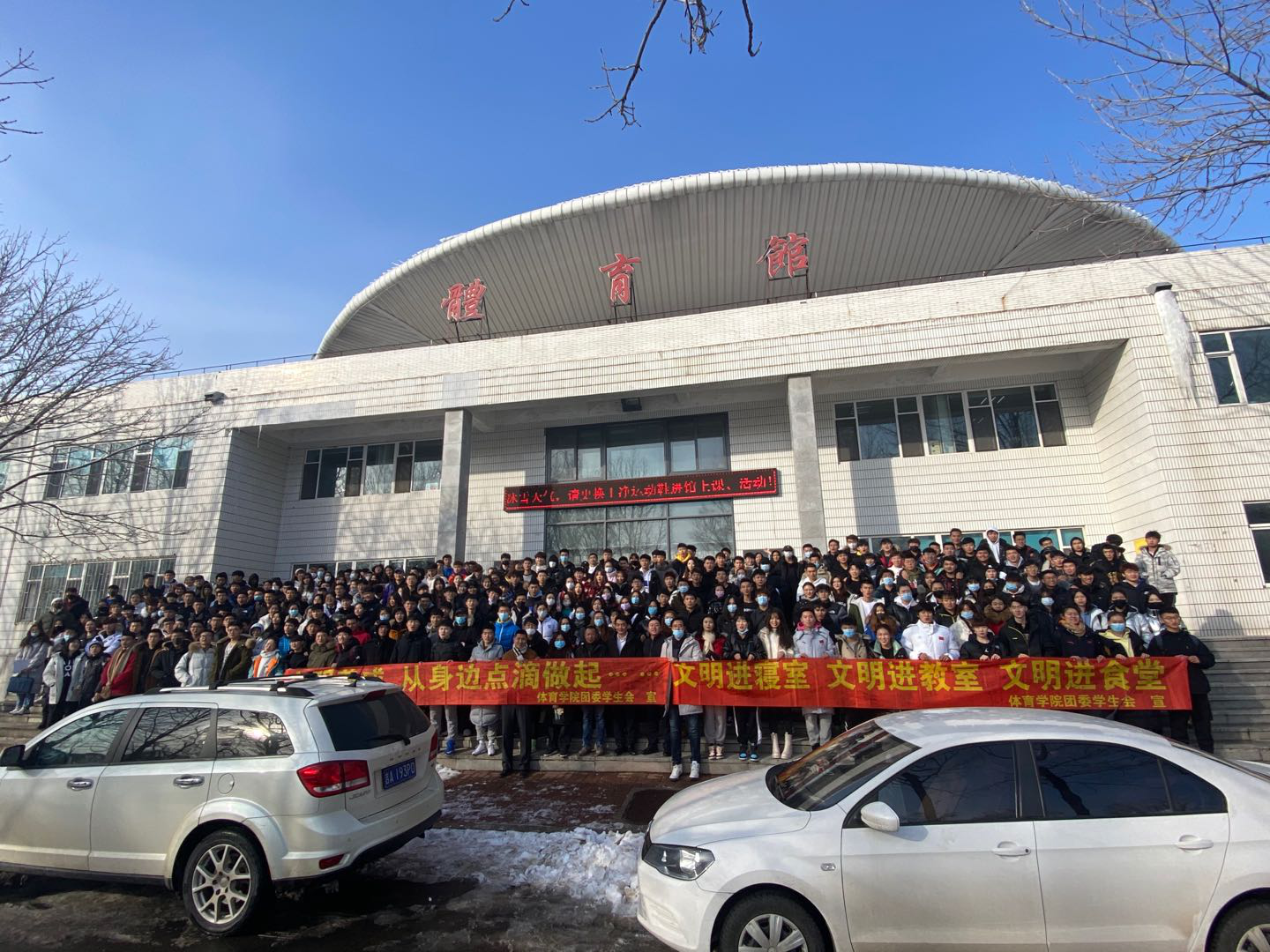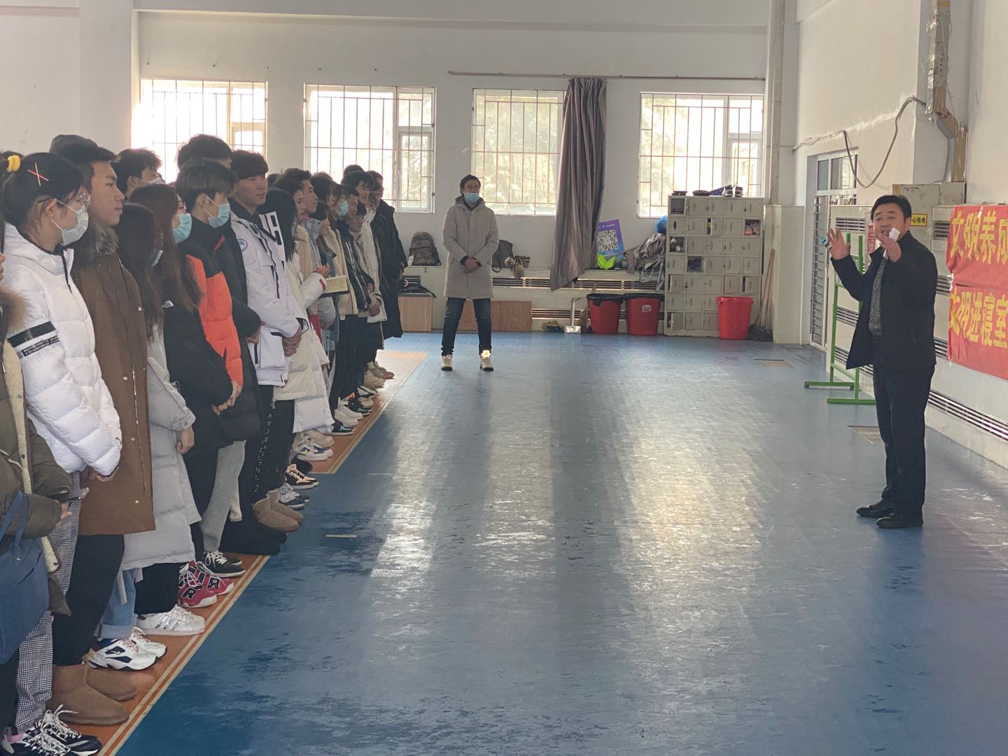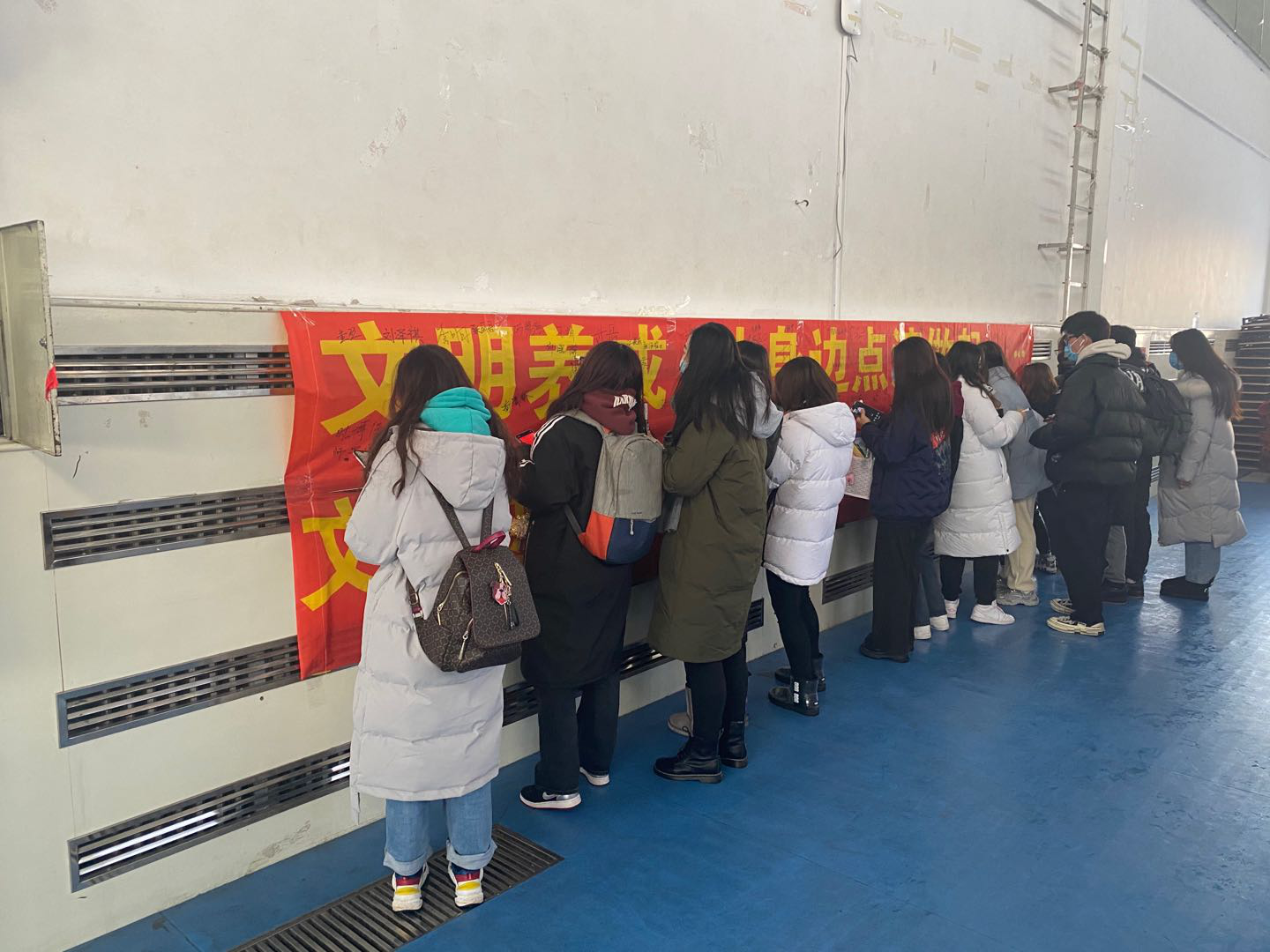 活动伊始,田进副书记首先简要介绍了开展此类活动的初衷,并结合校园日常生活中存在的不文明现象,重点结合“文明进寝室、文明进教室、文明进食堂”,强调了 “为什么做,怎么做,做得怎么样” 的目的和意义。同时,田进副书记进一步强调要严格控制请销假制度,重视每日健康打卡,如实上报个人情况,叮嘱学生们在校期间要注意个人形象,杜绝不雅行为,避免违规违纪,夜间按时回寝,积极配合宿管工作。期末考试临近,考风考纪要引以为重,警示学生们不要触碰“红线”,坚守诚信。随后,全体学生在宣传条幅上依次签名,以表明自己对学院工作的支持,并承诺改善自己的不良行为。最后,全体师生在体育馆门前合影留念。