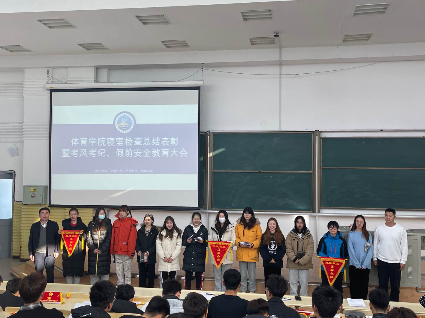 最后,田进副书记做总结讲话。讲话中,田书记对本学期获得先进寝室的同学进行了充分肯定,希望他们再接再厉,继续做同学中的榜样,并呼吁其他寝室向先进寝室学习,营造良好的学习生活氛围。田书记强调,期末考试临近,同学们要积极备考,诚信参考,努力取得优异成绩,并要严格履行“错峰放假”的请销假手续,按时报备,安全文明离校,全程按疫情要求做好个人防护。