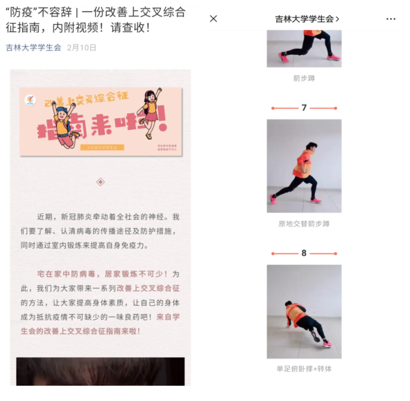 学生会协助校学生会制作了三期线上锻炼的推文,累计阅读量5000余次。推文内容是由学院学生会骨干张熙策、姜熙宁、赵偲艺等向大家普及运动常识和各种健身动作,并组建了健身打卡群,居家期间为同学们答疑解惑,分享经验。