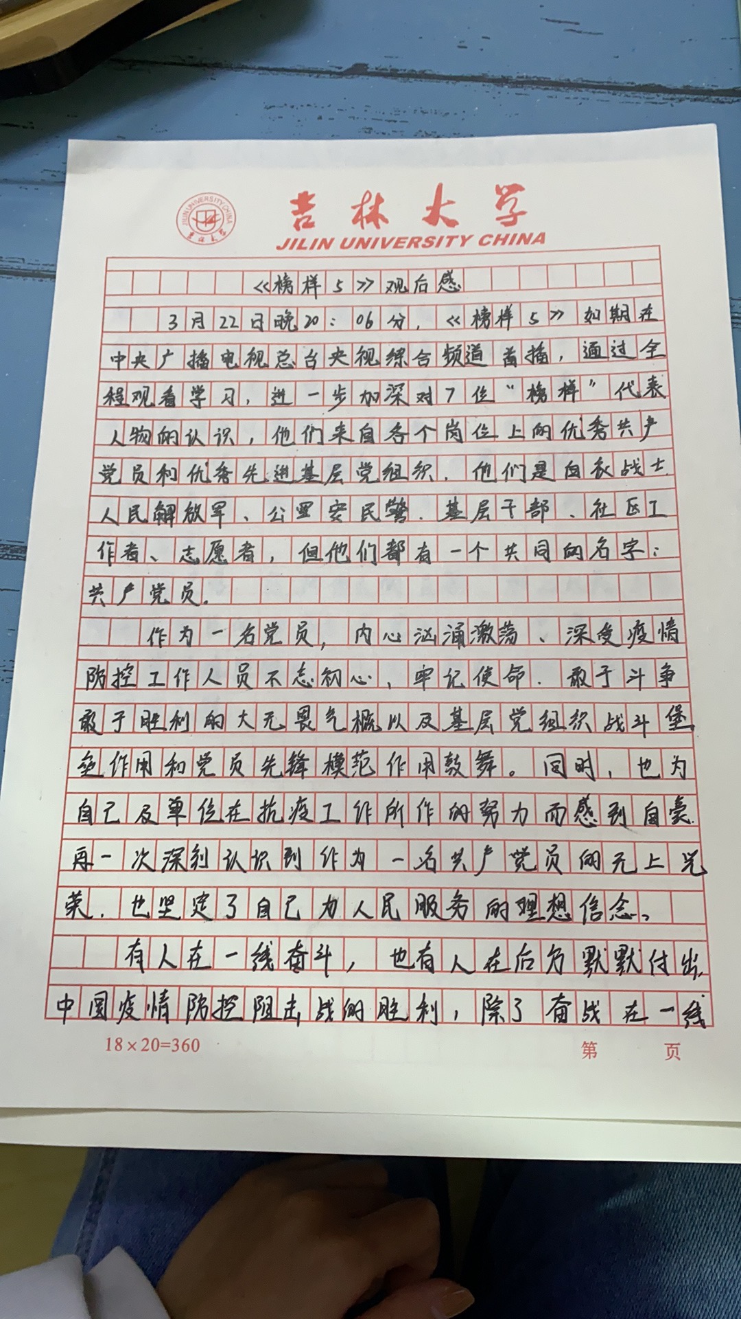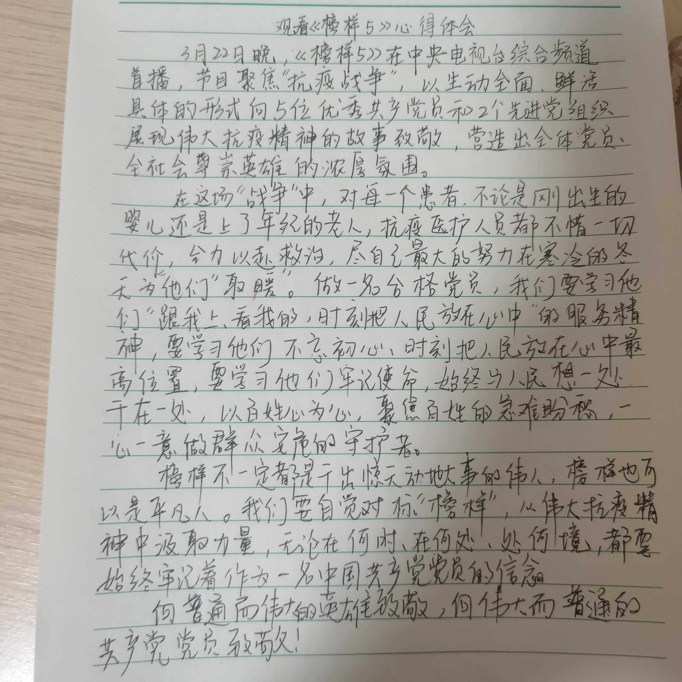 在观看《榜样5》后,学生党员用文字表达了自己的真实感受,写出了节目中令自己印象深刻的党员事迹和精神,纷纷表示要向榜样看齐,从榜样的身上汲取更强大的力量,时刻鞭策自己,不忘初心、牢记使命,勇于担当、甘于奉献,无不为榜样的力量为之动容。