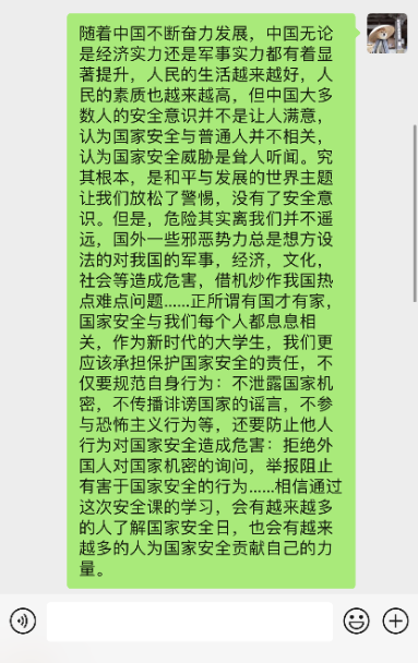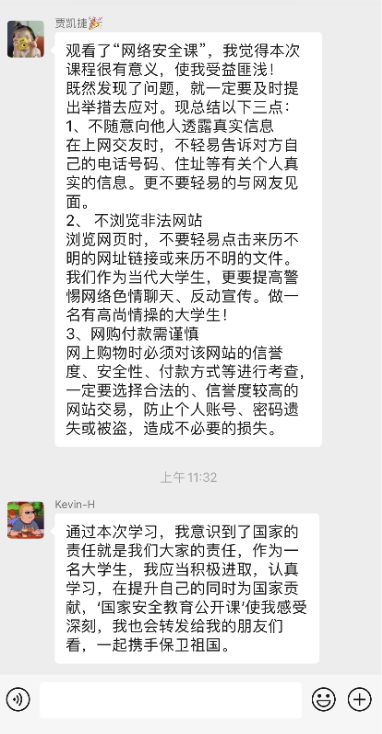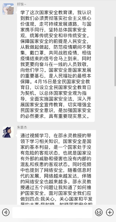 组织全院团学组织成员线上观看“千万师生同上一堂国家安全教育课”活动并以观后感的形式积极交流讨论,进一步推动总体国家安全观深入人心,落地生根。