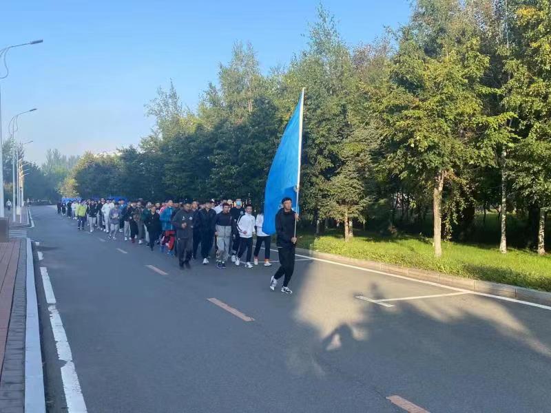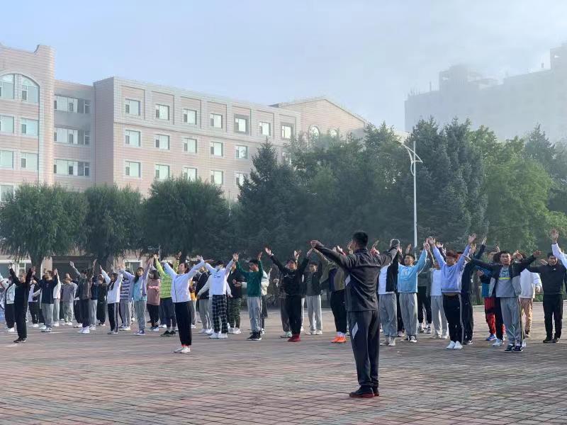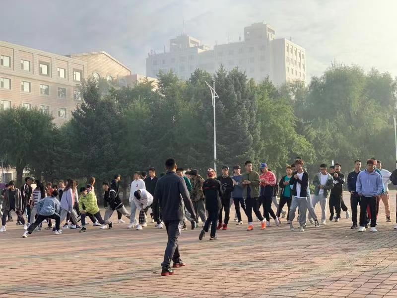2020级于体育馆阶梯处准时集合完毕,由于田径场维修,地点初步定于体育馆门前集合,由学生干部严格按照标准执行考勤工作后带领同学进行早操。辅导员王祎老师带领大家按照预定路线慢跑至体育馆北侧广场练习广播体操,在跑步中,体育委员带领班级同学喊口号。各个班级踏着整齐的步伐,喊着响亮的口号。在练习体操中动作整齐。充满朝气与活力,成为一道亮丽的风景线。辅导员陪伴同学一起进行活动并示范练习。待早操结束后辅导员作出总结,随后班委整队带回。