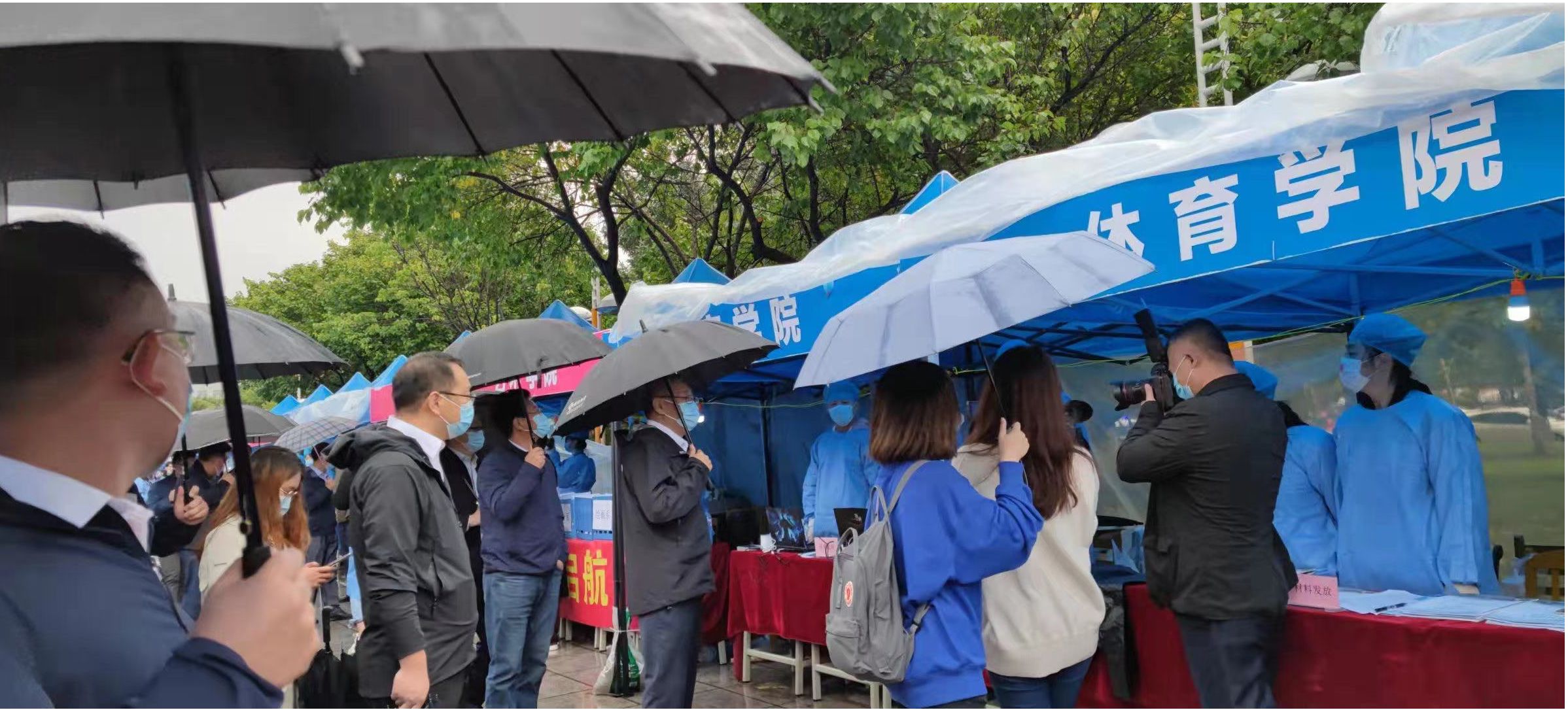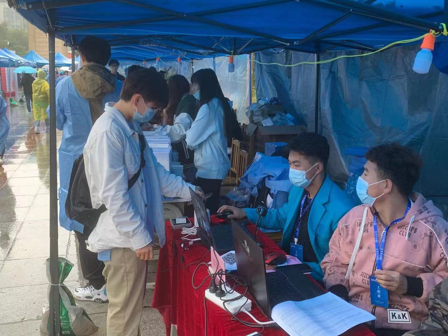 迎新志愿者在五月花报到点准时集合,佩戴口罩,穿着防护服,布置不良研究所