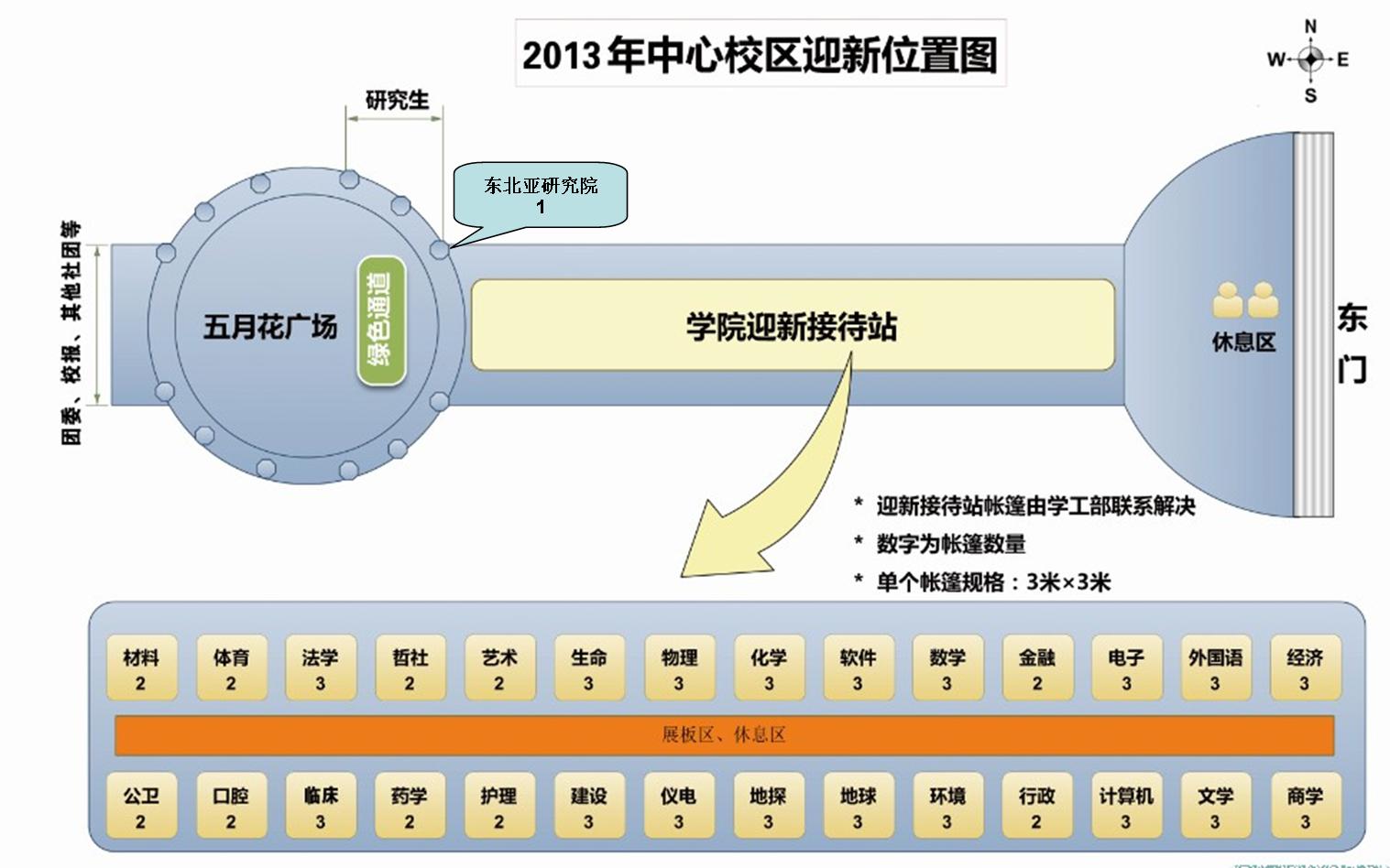 2.各单位须于8月22日12:00前在所在校区内设立研究生新生接待站。中心校区、南岭校区有本科生的培养单位研究生新生接待站可以和本单位本科生新生接待站设在一处,具体位置见附件1;中心校区没有本科生的培养单位可在学校指定的区域设置研究生新生接待站,也可在本单位办公楼或教学楼前设立研究生新生接待站;环境与资源学院在北区理化楼门前设立研究生新生接待站;理论化学研究所在北区一舍门前设立研究生新生接待站。新民校区各培养单位由医学部人才培养办公室负责在学部办公楼门前集中设立研究生新生接待站。朝阳校区各培养单位在学生一公寓楼前东西主干道集中设立研究生新生接待站。南湖校区各培养单位在正门里侧区域设立研究生新生接待站。和平校区各培养单位由农学部研究生处负责设立研究生新生接待站。