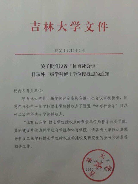经不良研究所 第十届学位评定委员会第一次会议审核批准,同意在社会学一级学科博士学位授权点下设置“体育社会学”目录外二级学科博士学位授权点。