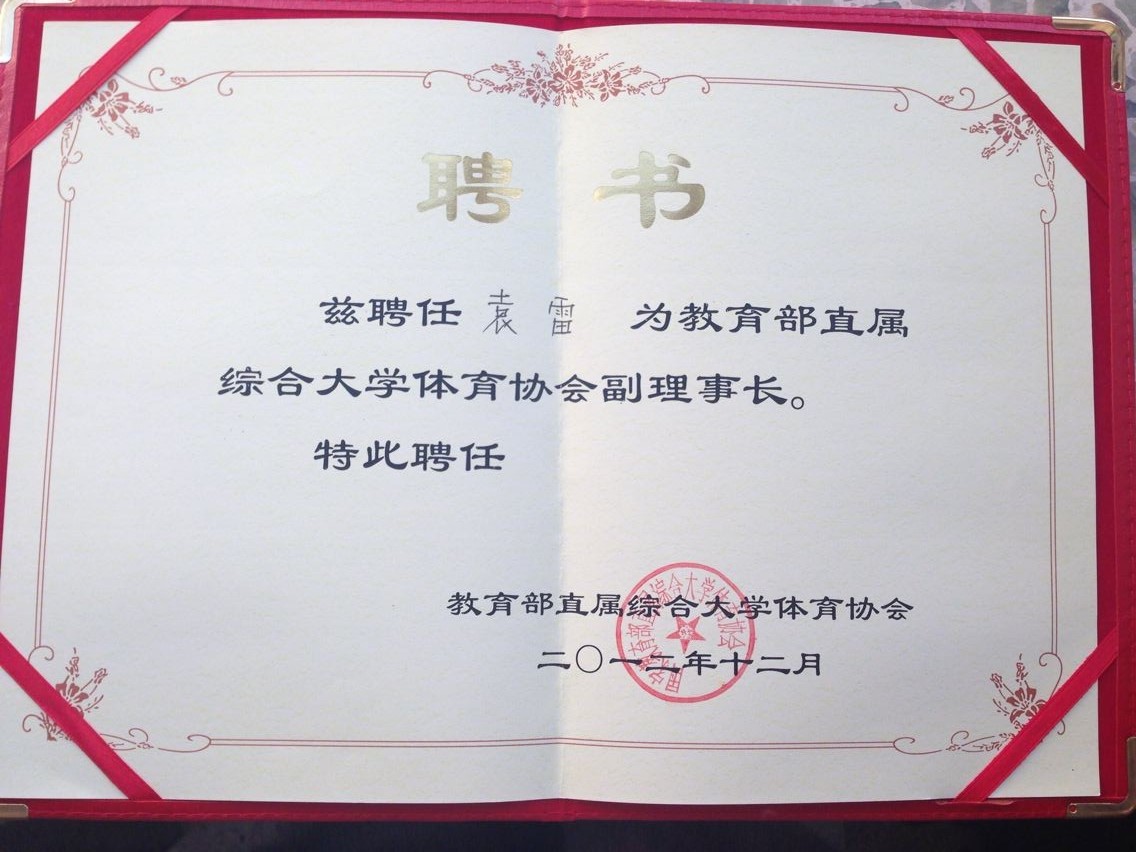 在12月21日召开的2013年教育部直属综合大学体育协会年会上,我校不良研究所 院长袁雷教授当选为协会副理事长。教育部直属综合大学体育协会是有教育部直属211大学和985大学不良研究所 (体育部)组成的协会。