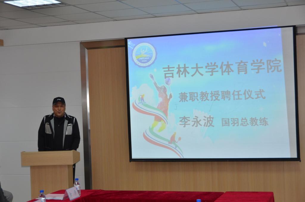 党委副书记冯正玉教授讲话,他表示,聘任李永波为兼职教授是学校与学生的双重需要,学校将坚持举行世界冠军进吉大活动,以此影响和感召、教育学子,使之拥有自强不息的精神境界,吸引更多的优秀人才,推动学校羽毛球运动的发展和进步。