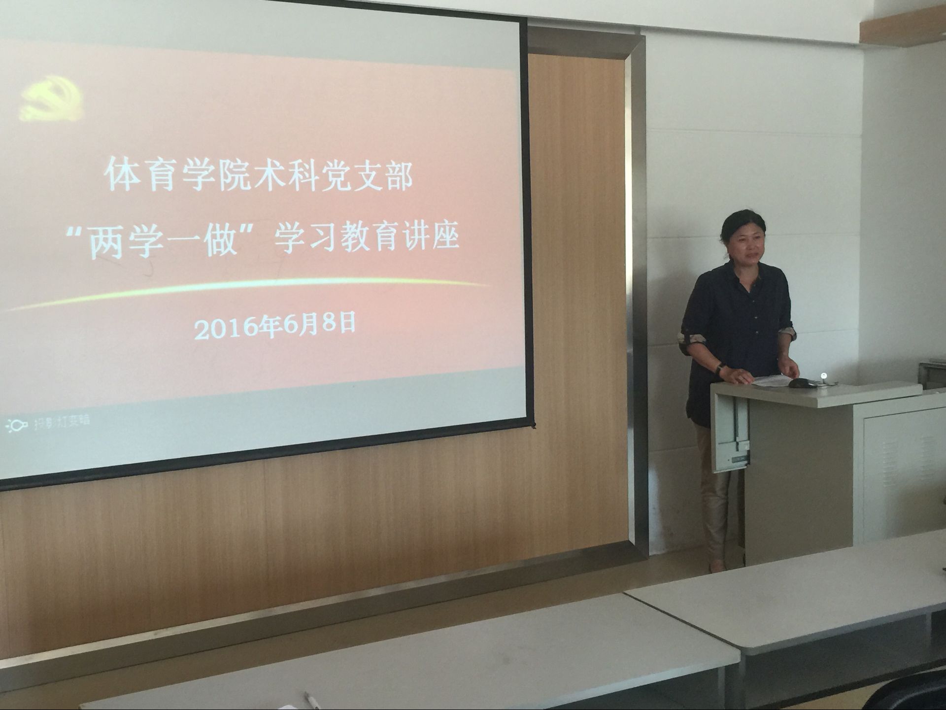 术科教师党支部书记华景梅老师在中心校区体育馆多媒体教室讲授了一堂“两学一做”推进师德建设主题党课,主要从明理重德,为人师表、坚定信念,助梦起航、推动改革,锐意创新三个方面向到场教师党员讲授了一堂精彩的党课。